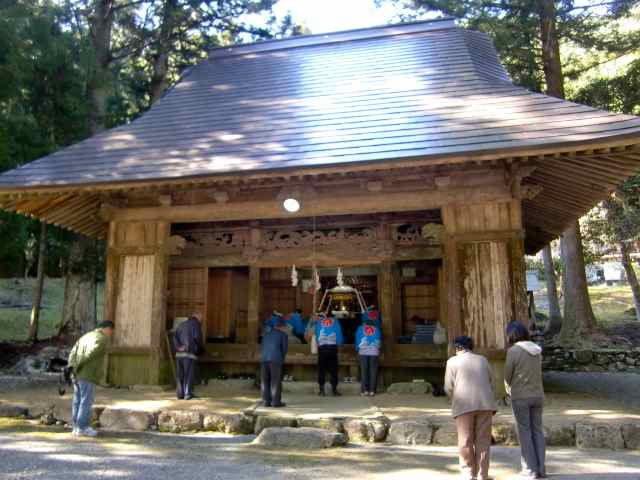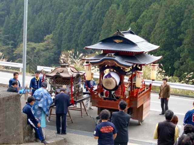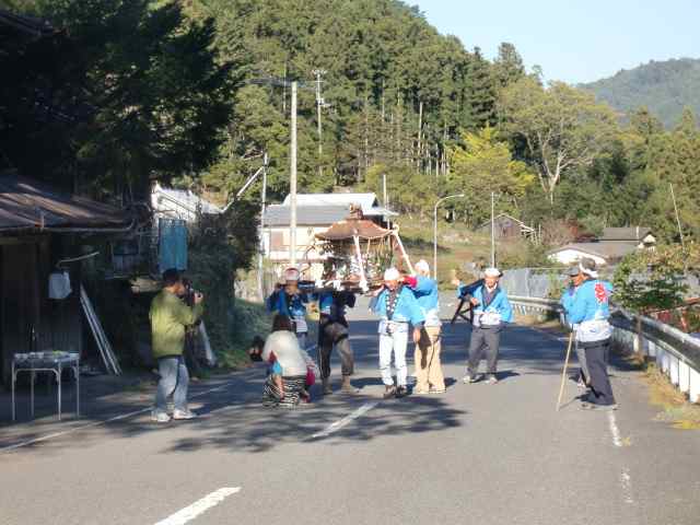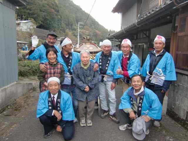 だんじりはなく、こぶりの御輿を4人で担いで行くのを途中までついて行ったが、かなり遠くまで行くので諦める。 あちこちでお神酒をいただいた御輿が、いとこの家へ来たのは約4時間後! みんなで記念撮影。 晩ご飯までいただき、送ってもらって帰って来た。 |