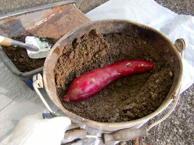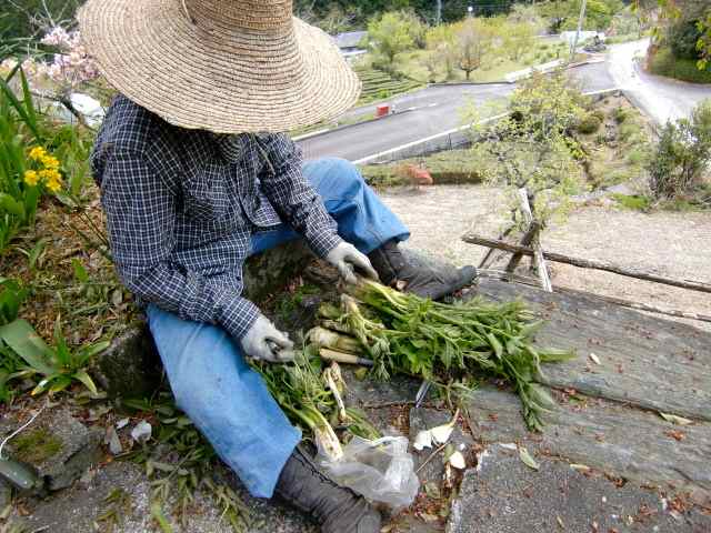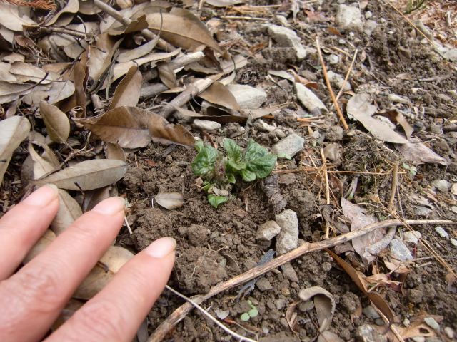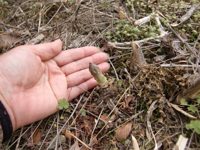 1ケ月ほど植えるのが遅かったらしく、よそはもう葉が茂っているが、うちも芽が出たから、できるかな? 独活(うど)をとった時に思ったんだけど、店で売っているのは盛り土をして暗闇の中で育てるから白いわけで、野生のも枯れ葉とかで覆っていると柔らかくて食べられる部分が多いんだよね。 で、去年アスパラガスができたとこも枯れ葉をかけておこうと行ってみると、ゲッ、もう出てる! 遅いかな〜 |