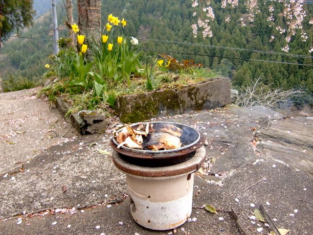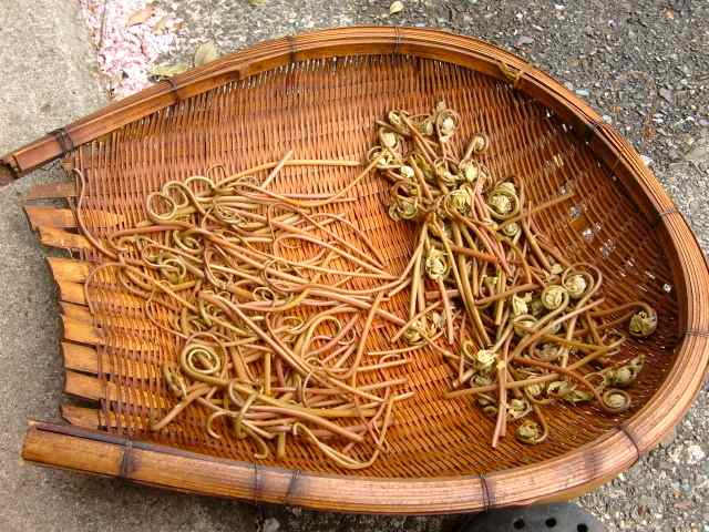 道路脇には山吹、山桜、つつじ等が満開! お昼は炭火を熾(おこ)して鯖と椎茸を焼く。 午後は父とわらびとり。ようやく芽が出た感じで、香港のわらびに比べとても太く、こ〜んなに大きいのも! |