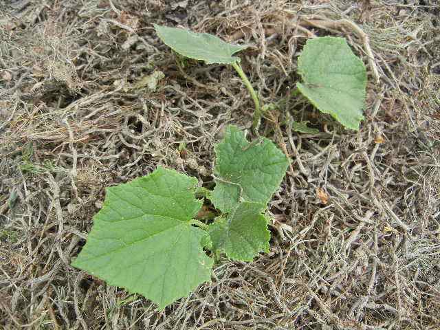 勝手に生えたキュウリも移植しようかと思ったが、枯れるとイヤなので肥料をやり、枯れた杉菜の根で囲う。