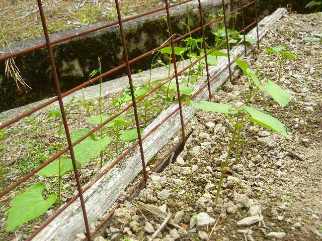 5月27日、肥料を施した畑に良いマーブルの豆を選んで、蔓が出たら猪除けの柵に掻きつけるよう蒔いたわけだが、選に漏れたのを捨てるのはもったいなく、30日に猪除けの柵の下に適当にバラ蒔いた。