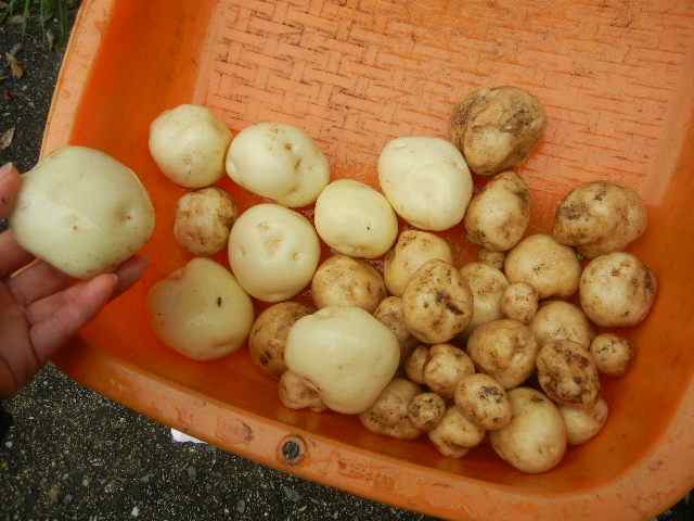 お〜できてるできてる! ところが3株掘ったとこで雨が降り出したので中止。父のほど大きくはないし数も少ないが、種芋3個がこーんなに増えるのだから農業ってエライなぁ。(笑) 新ジャガは洗らうと面白いように皮が剥ける。鯛をいただいたおっちゃんにもお裾分け。 |