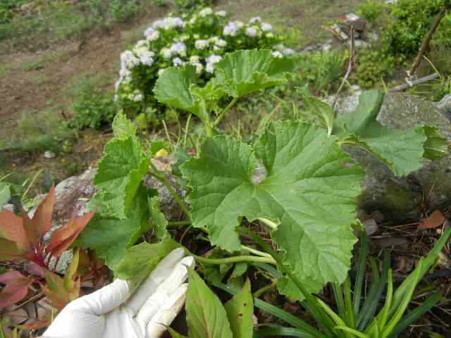 ようやく今朝はジョギングができる程度の霧雨となり、昨日からの懸案、庭に生えたカボチャ(だと思う)と…