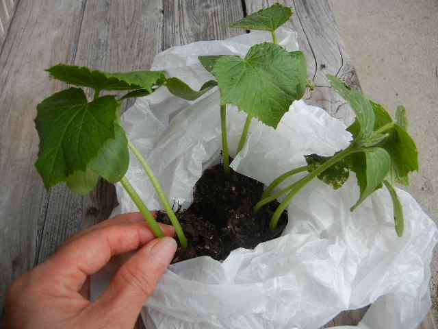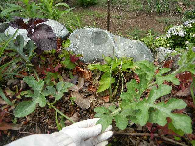 スイカを移植する。ところが、植え終わったらまた雨が降り出し、移植後の写真はなし。まぁこの時ばかりは、( ̄ー ̄)ニヤリッ。晴れるより根付きやすいからね〜 |