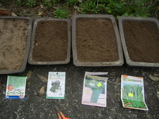 かなり暖かくなったから、懸案の種蒔きをした。左から、友達のベトナム土産の絲瓜(十角糸瓜=トカドヘチマ)、芥蘭(がいらん)、菜心(ちょいさむ)。