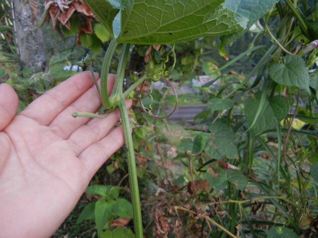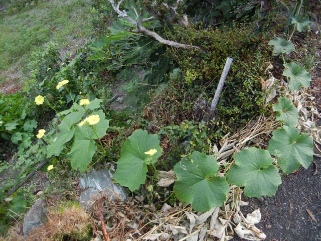 十角糸瓜(トカドヘチマ)が、伸びすぎて石垣の下から庭まで這い上がって来た!