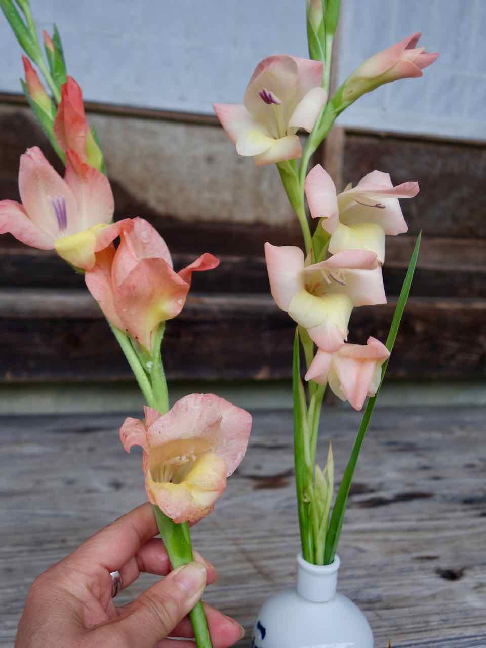 ひょろっとしてるから倒れやすく、一昨日倒れたのを花瓶にさしてて、今朝も倒れてたから追加でさそうとしたら、同じグラジオラスなのにかなり色が違ってて驚いた。不思議。