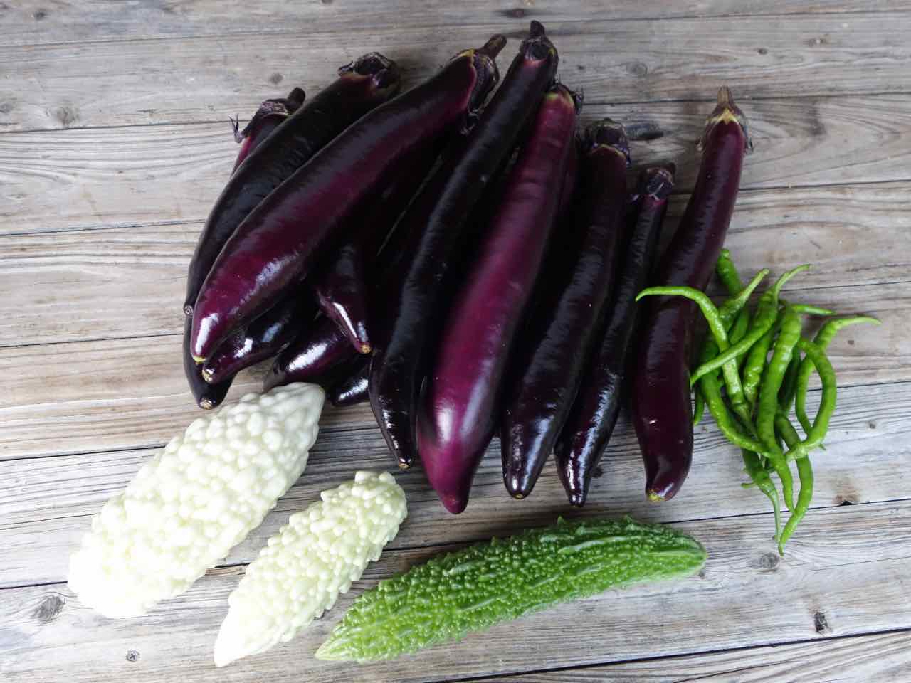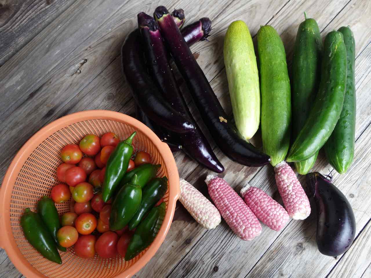 結果からいうと、お昼に焼き茄子とキュウリのサラダ、おやつにトマトと餅きびを食べ、夕食に豚肉と茄子、トマト、ピーマン(トマトと一緒にザルに入ったシシトウみたいなの)の炒め物、9日の朝にキュウリを食べることで解決!