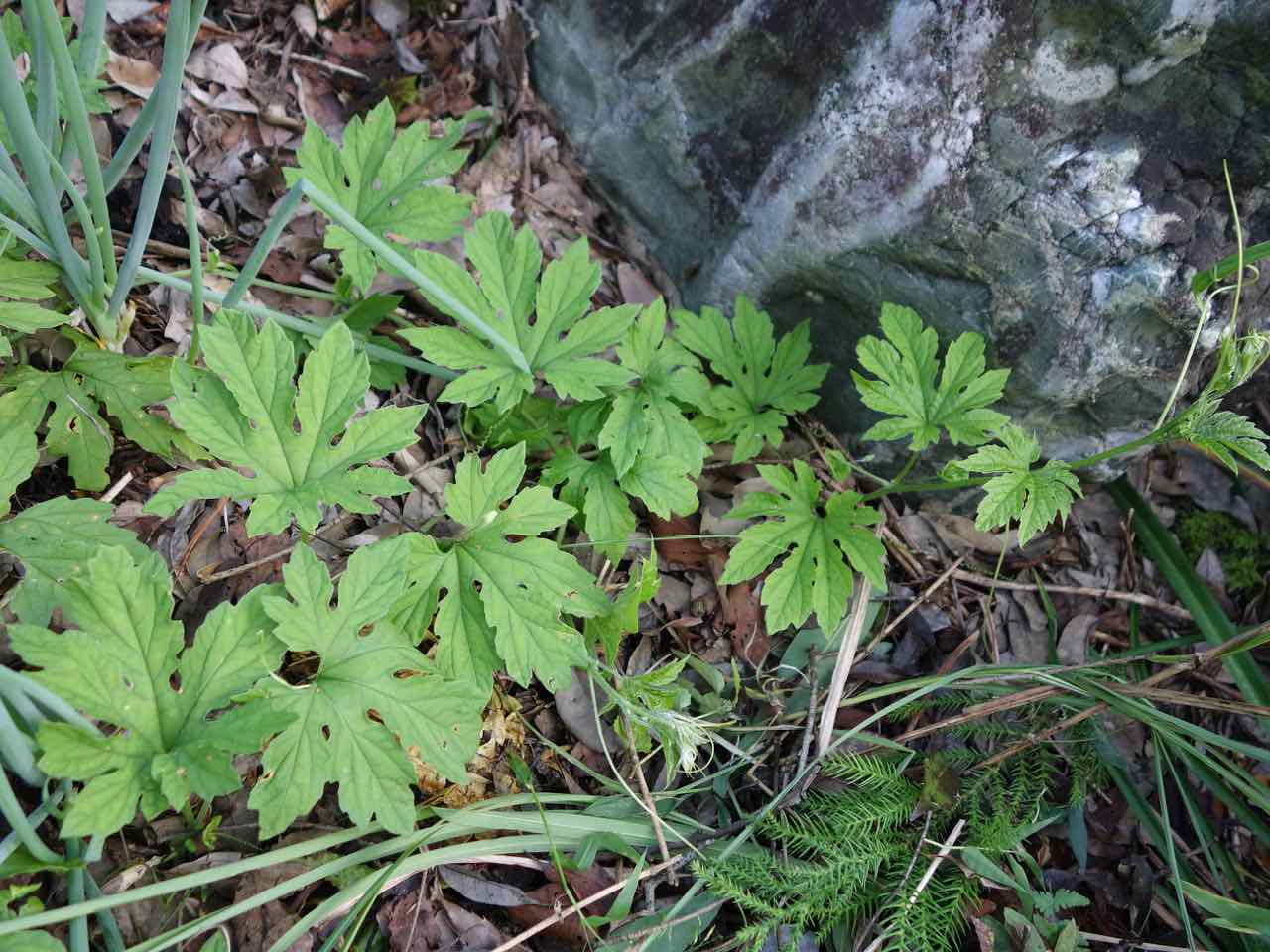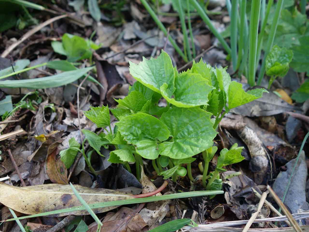 蔓も伸びてる。これは… ゴーヤに違いない! 今年はゴーヤを作ってなく、もちろん種も蒔いてないから、近所でいただいて食べたゴーヤに違いない。もちろん青いゴーヤで、種は熟してるわけないから、それが芽を出すって、すごくない? |