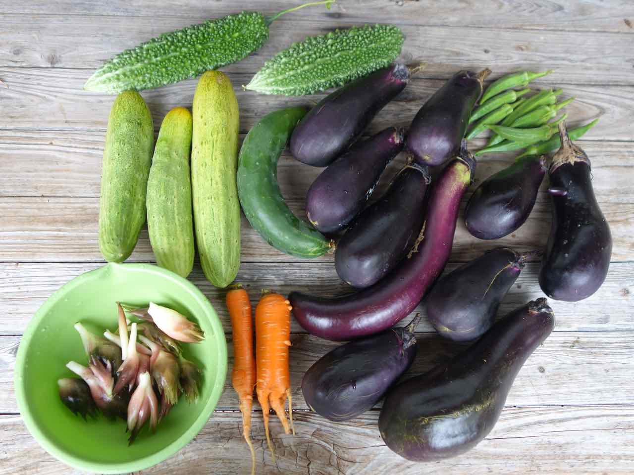 散歩仲間のMちゃんにゴーヤとオクラとナス、東隣のおばちゃんにキュウリとミョウガと人参をいただいたんだが、もらいすぎたかなぁ? ^^;