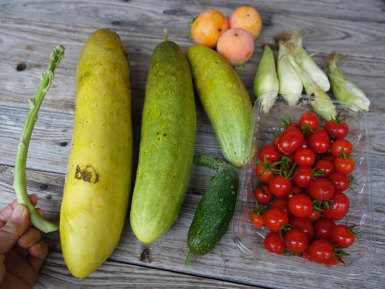 キュウリは熟れすぎてるし、柿は虫が入って色が変わったのかと思ったら甘い。なぜかこんな時期にアスパラガスができてるし、今年の秋が早いのは一時的なものかと思ったが、もう気配を感じているのかな? |