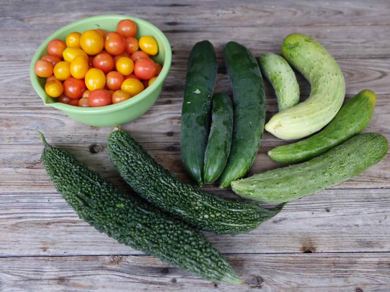 夏野菜もそろそろ終わりだが、近所でもらったトマト、キュウリ、ゴーヤ。今日はこの夏一番の暑さで35度! 頂上ヒュッテだと朝は15度前後だから信じられないくらい暑かったけど、明日からまた週末は剣山です。 |