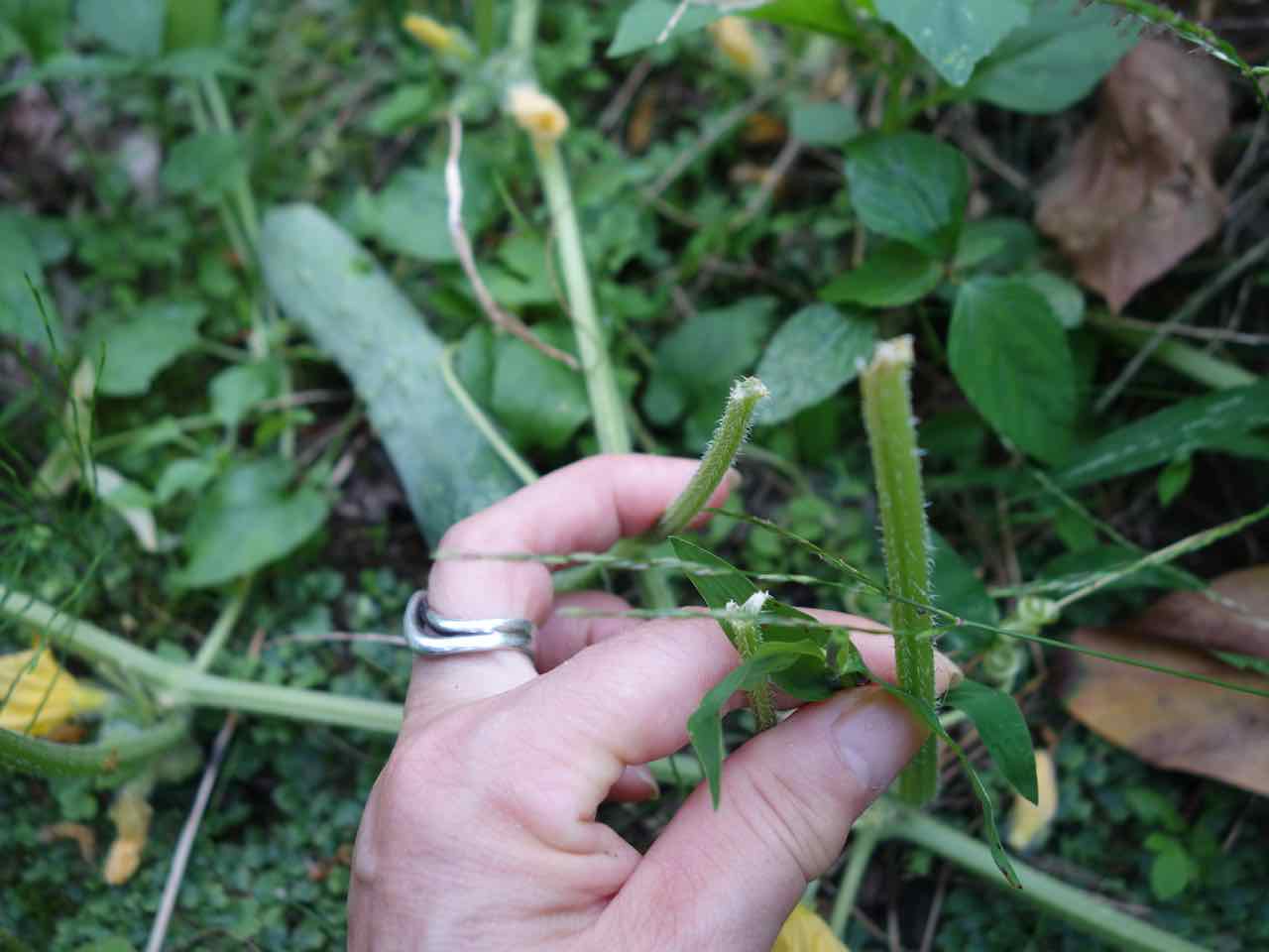 もうほとんど夏が終わりそうになって、ようやく実をつけ始めたうちの夏野菜たちの葉を何者かにかじられた!(;_;) ナスとキュウリに…