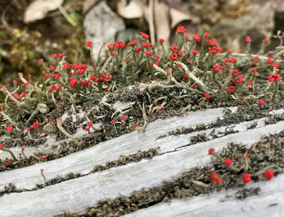 昨日の苔みたいなの、調べたら名前がわかった。硫黄苔(いおうごけ)と言うそうだ。だが、「苔」と言いながらコケ植物ではなく、地衣類なんだって。地衣類って苔のことじゃないの?と思ったら、菌類(カビやキノコの仲間)と藻類(そうるい)が共生して一つの体を作っている共生生物で、植物ではないそうな。