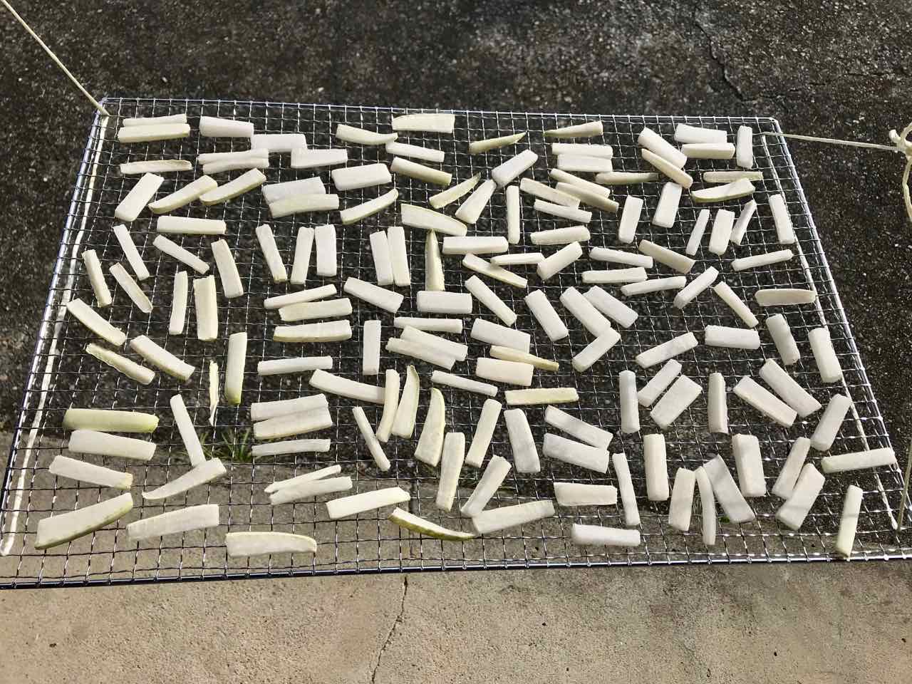 http://moriqzou.blog.shinobi.jp/Date/20200110/1/ http://moriqzou.blog.shinobi.jp/Date/20191227/1/ しかし非常に水水しくて、塩分少な目で作るから前回はそのまま漬けるとあまり日持ちしなかったような気がして、塩をふって水分を抜くことも考えたが、それだと養分を捨ててしまうことになり、今回も干すことに。 陽が翳る頃いい感じにしんなりしたので、これを漬けた。 PR |