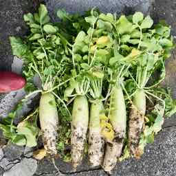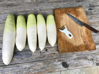 東隣のおばちゃんがなかなか帰って来ない〜 よってお言葉に甘えて、おばちゃんが作っていた白菜、カリフラワー、ほうれん草は何度かいただいたが、大根は他でいただいたので食べられず、20本以上あるかな? いつまでも放置できないし、切り干し大根を作ろうかと昨日5本もらってきた。(赤いのは私の長靴の先)