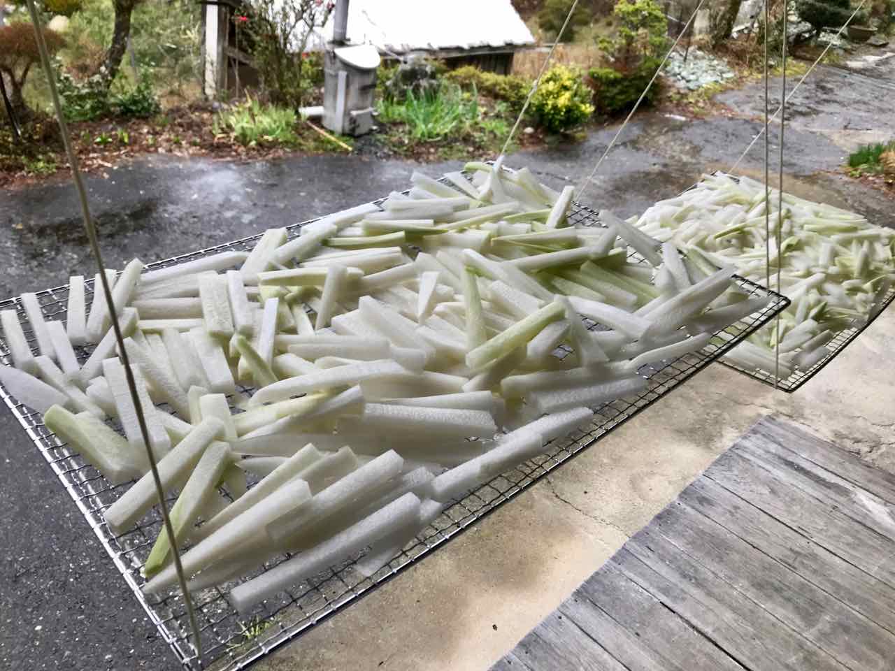 予報に反して雨はなかなか上がらず寒い中、縁側で切り干し大根作りスタート。太めの棒状に切るのは初めてだが、丸々一本とかスライスは子供の頃のお手伝いで作ったことがあり、皮を剥いて切って干すだけ。