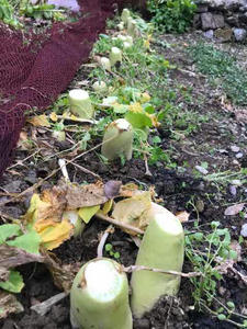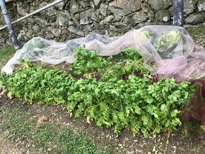 網をめくって持参した包丁で葉を切る。(奥の網の下はキャベツとカリフラワーの残骸)