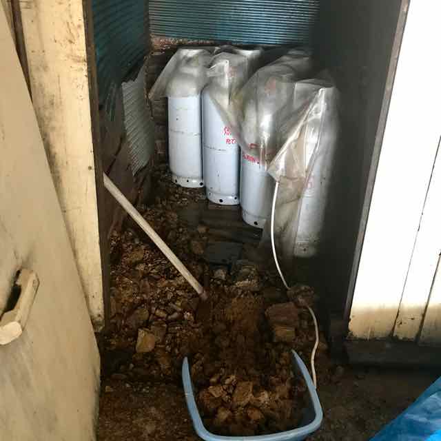 ヒュッテのガスポンベ室、崩落!(男性陣が修理)