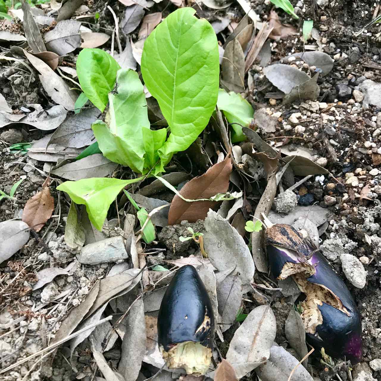 帰宅して、もらったサラダ菜の苗の様子を見に行くと、下界も雨だったのだろう8本とも根付いていてウサギにも食べられてなく、ホッ! だが、しかしナスの実が〜、何者かに齧られていた〜!(;_;)
