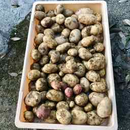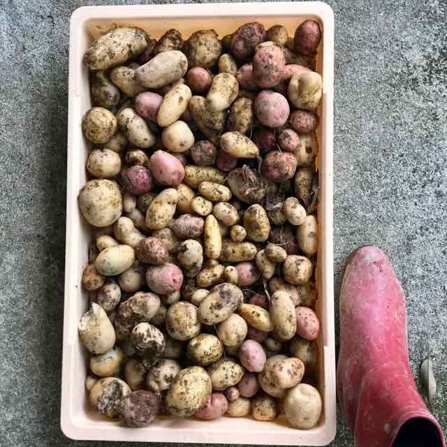まずは第一段、下の家のおばちゃんにもらった飢饉知らず。実際この名前のジャガイモは存在しないようで、赤い祖谷(いや)ふどが少し混じっているが、みなさんが言ってたように、うちのも小さくて出来が悪い〜