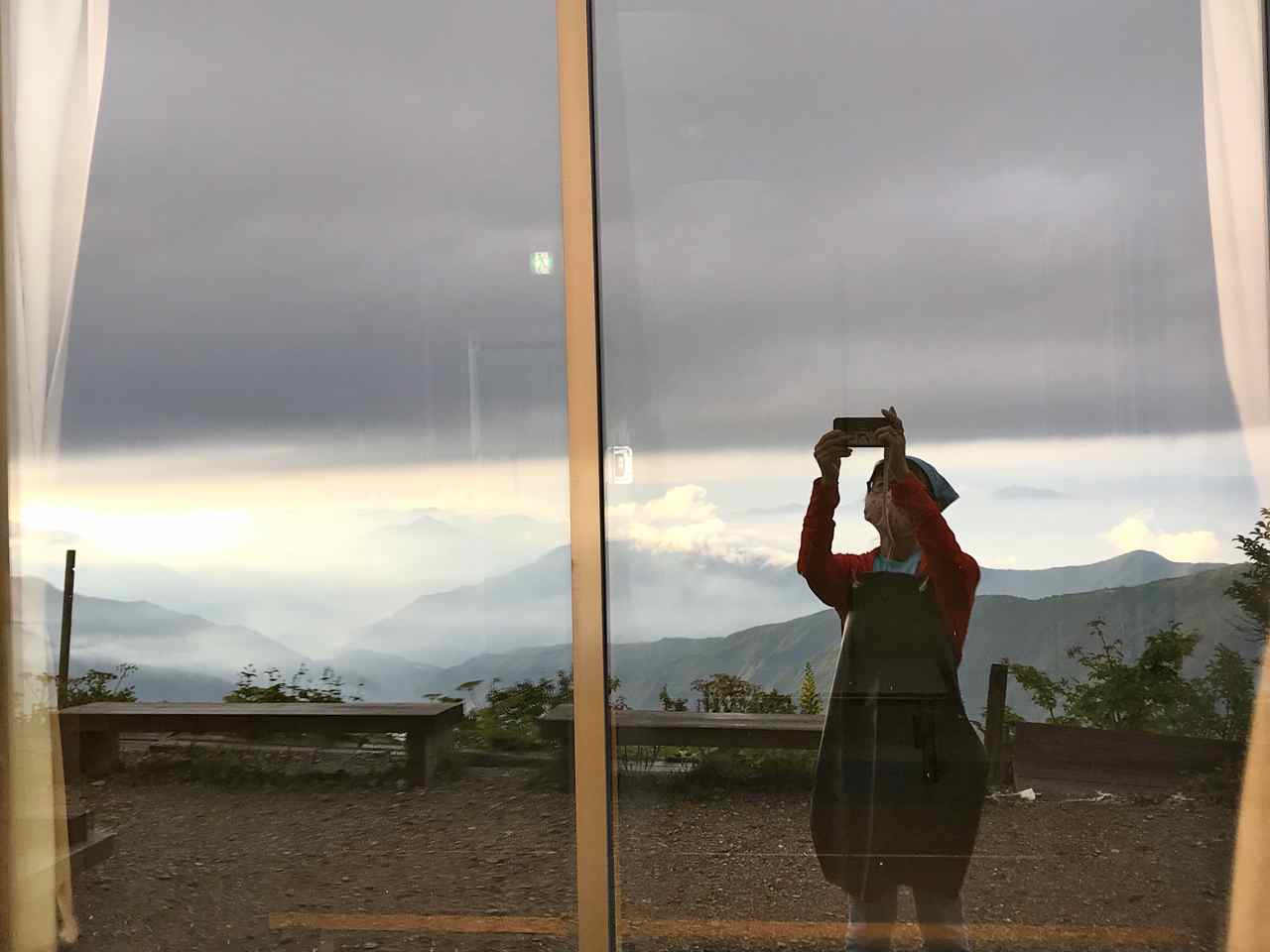 そして6:50、ちょいと変わった自撮りをしてみた。ヒュッテの窓に映ったアタクシであ〜る。窓の中央で背景の上下の色が違うのは、下界と上界を分断するように霧?、雲?、がかかったから。
