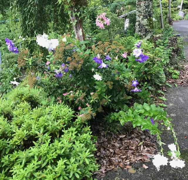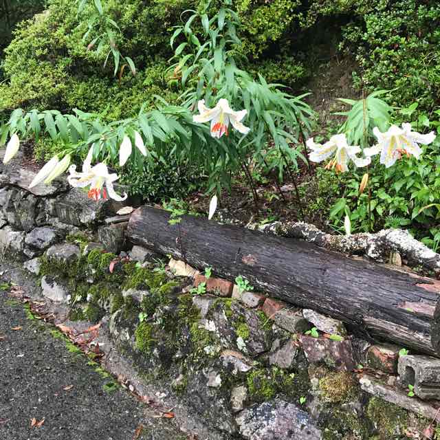 今日も雨が降ったし雷さえ鳴ったが、半日以上降らない時間があったのは久しぶり! さて、昨日はうちの桔梗を載せたが、今日は東隣のおばちゃんちの百合である。うちの同様これも倒れていて花が見えない〜