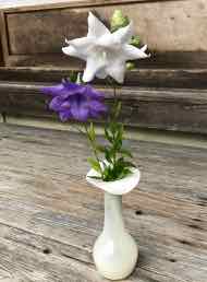 でも夕方には上がったので外に出てみると、庭の桔梗(ききょう)が激しく倒れている! 棒を立てて紐でゆわえて立たせようかとも思ったが、切って花瓶にさすことにした。 |