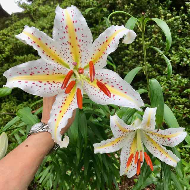 こーんな立派な花なのにね。調べると、オーラタムゴールドバンドって言う百合らしい。 |