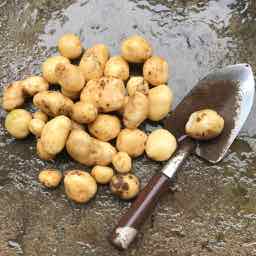 大阪に行っている間にかなり雨が降ったようで、大きくなった草を取らなきゃいけないんだが畑はまだ乾いてなく、本体が枯れ始めたジャガイモを掘ってみることに。