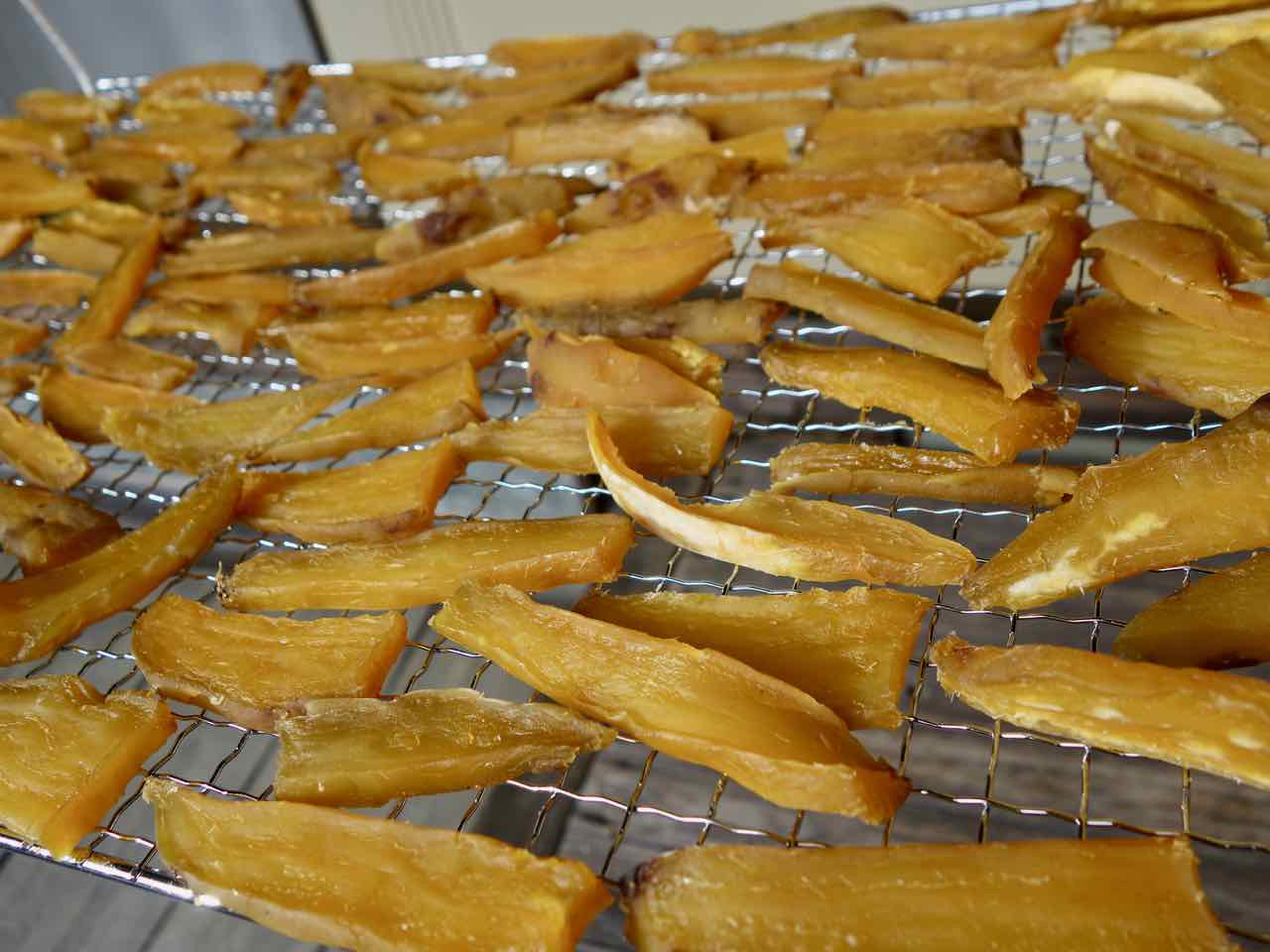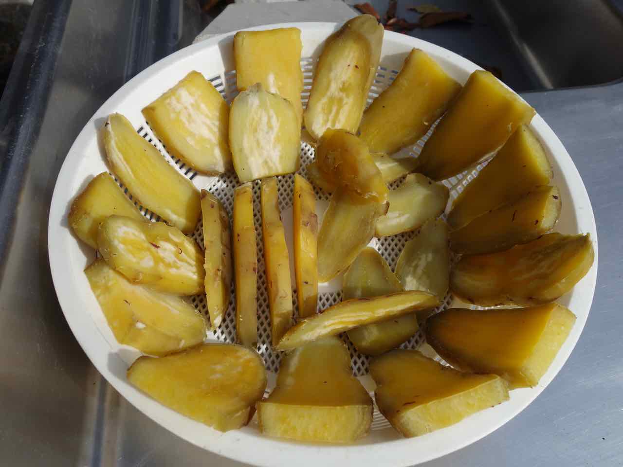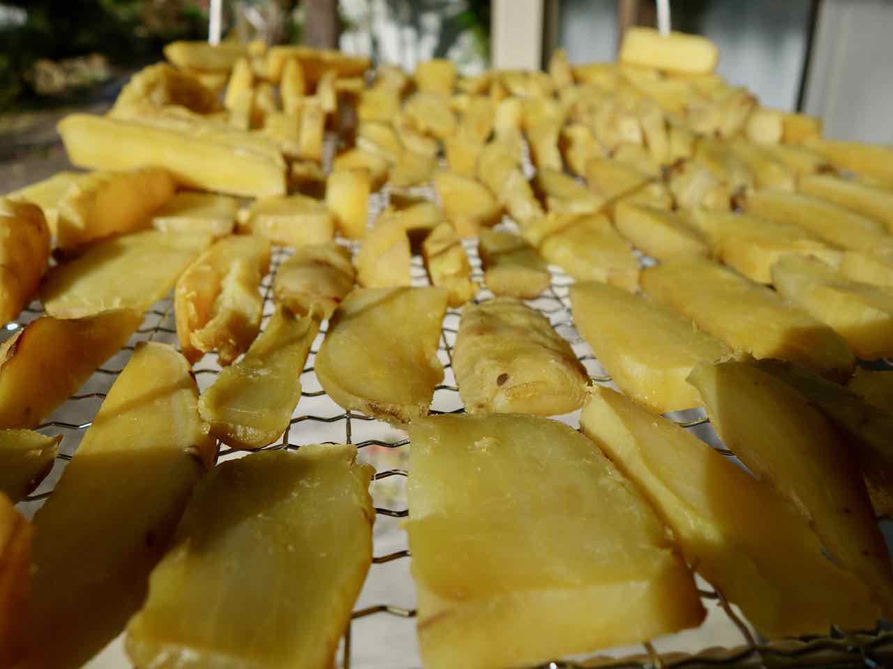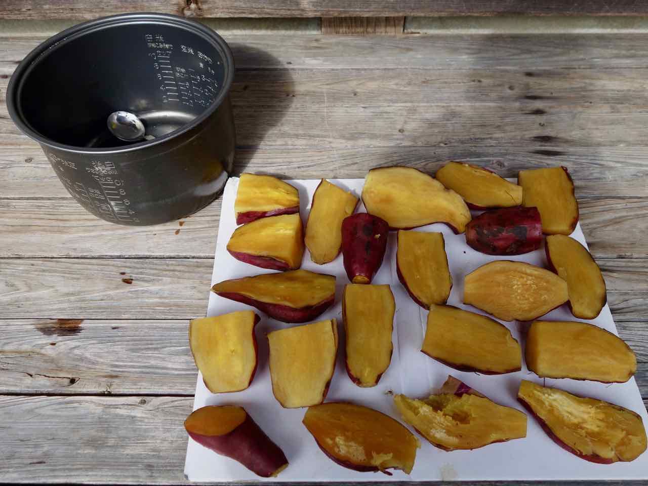 http://moriqzou.blog.shinobi.jp/Date/20180919/1/ 25日にもらったらもっと大きくなってて、こりゃ〜食べ切れないとあれこれネットで調べ、天気がいいので干し芋にすることに。 まず、土つきだったので26日に洗い… 27, 28, 29日と天日干し。そして今日、炊飯器で蒸した、というか炊いた。うちのは玄米炊き機能があって、玄米はゆっくり炊けるから、さつま芋も玄米モードで炊くと甘〜くネットリした、干し芋に適した芋になるんだって。 ほどよい大きさに切ったのが全部入り、水加減は3〜4センチ。切り口を下にして入れたから一番下がくっついてスプーンで剥がしたけど、とってもいい感じに炊けた! 粗熱をとって皮を剥き、その後スライスして干したんだけど、写真を撮り忘れたのでまた後日。(^^) |