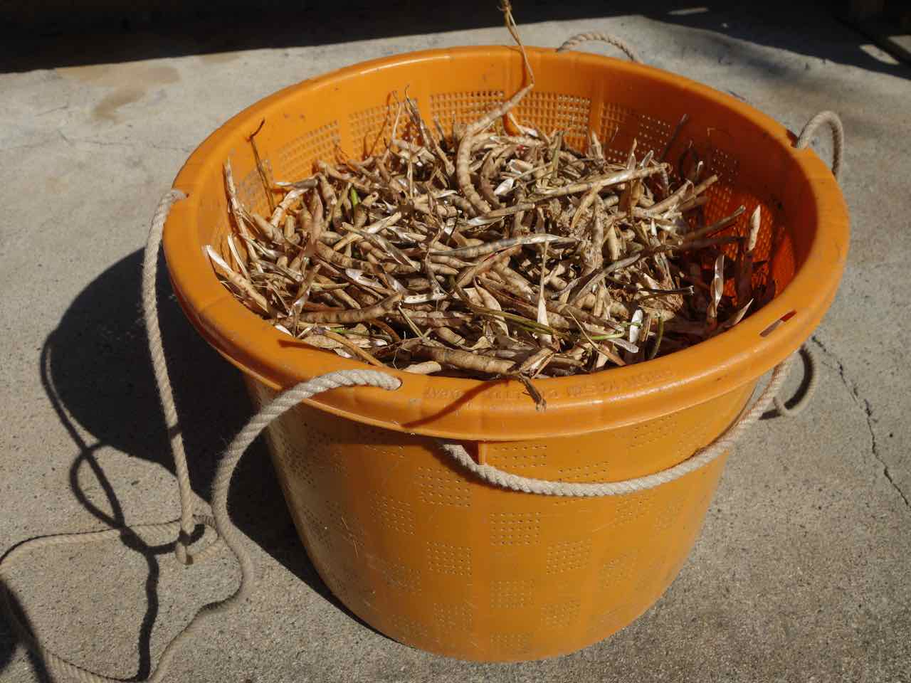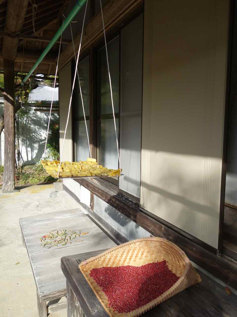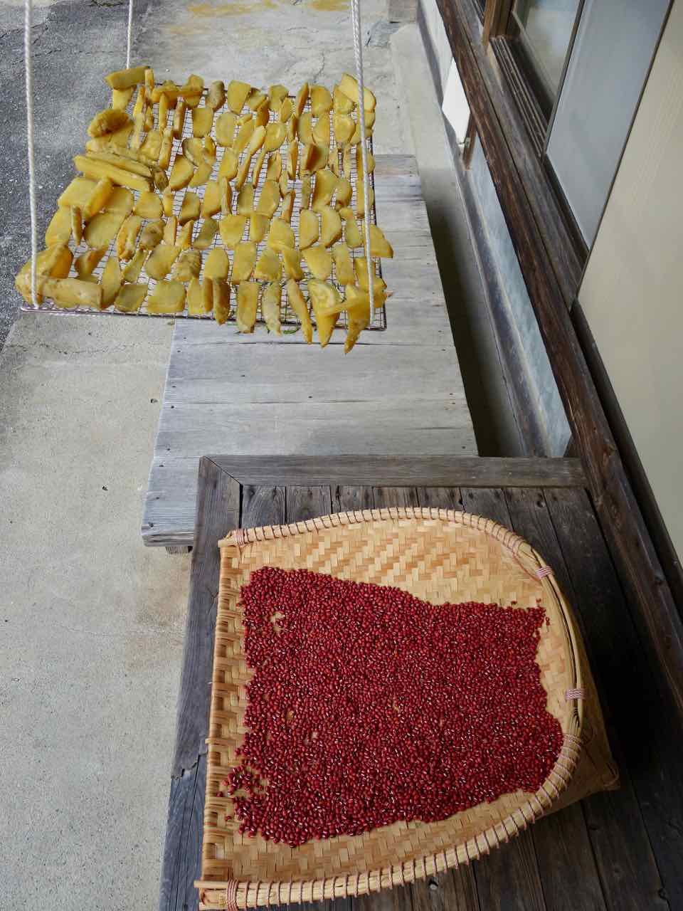 殻から出したら水に浸け、ゴミや食べられない実を選別。乾かしたらもう一度選別して箕(みの)に入れる。 で、昨日作った干し芋。うちには虫除けネットがついた干し網がないから、BBQ用の網を物干しに吊るして代用。 こんな感じで乾かしてる。 |