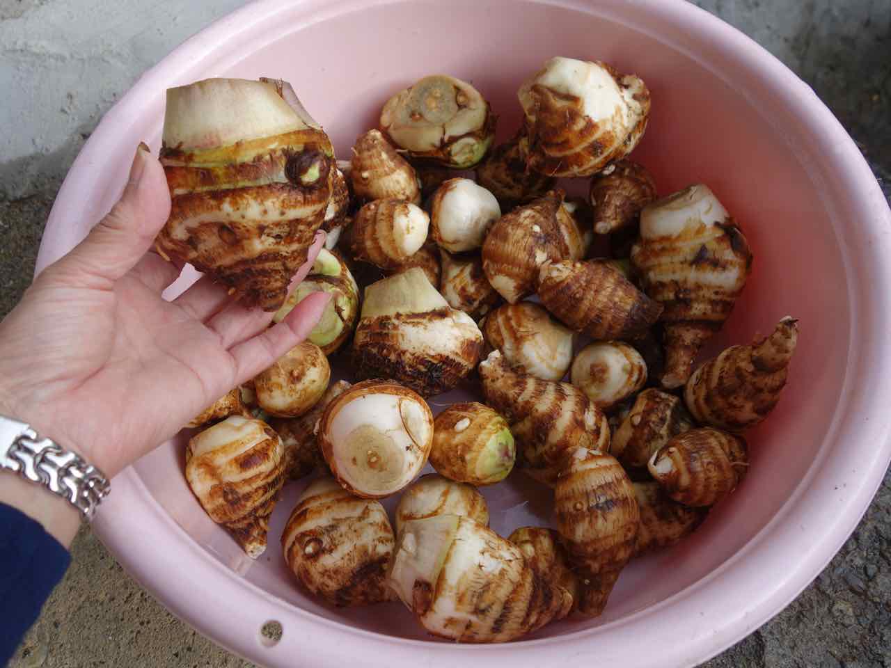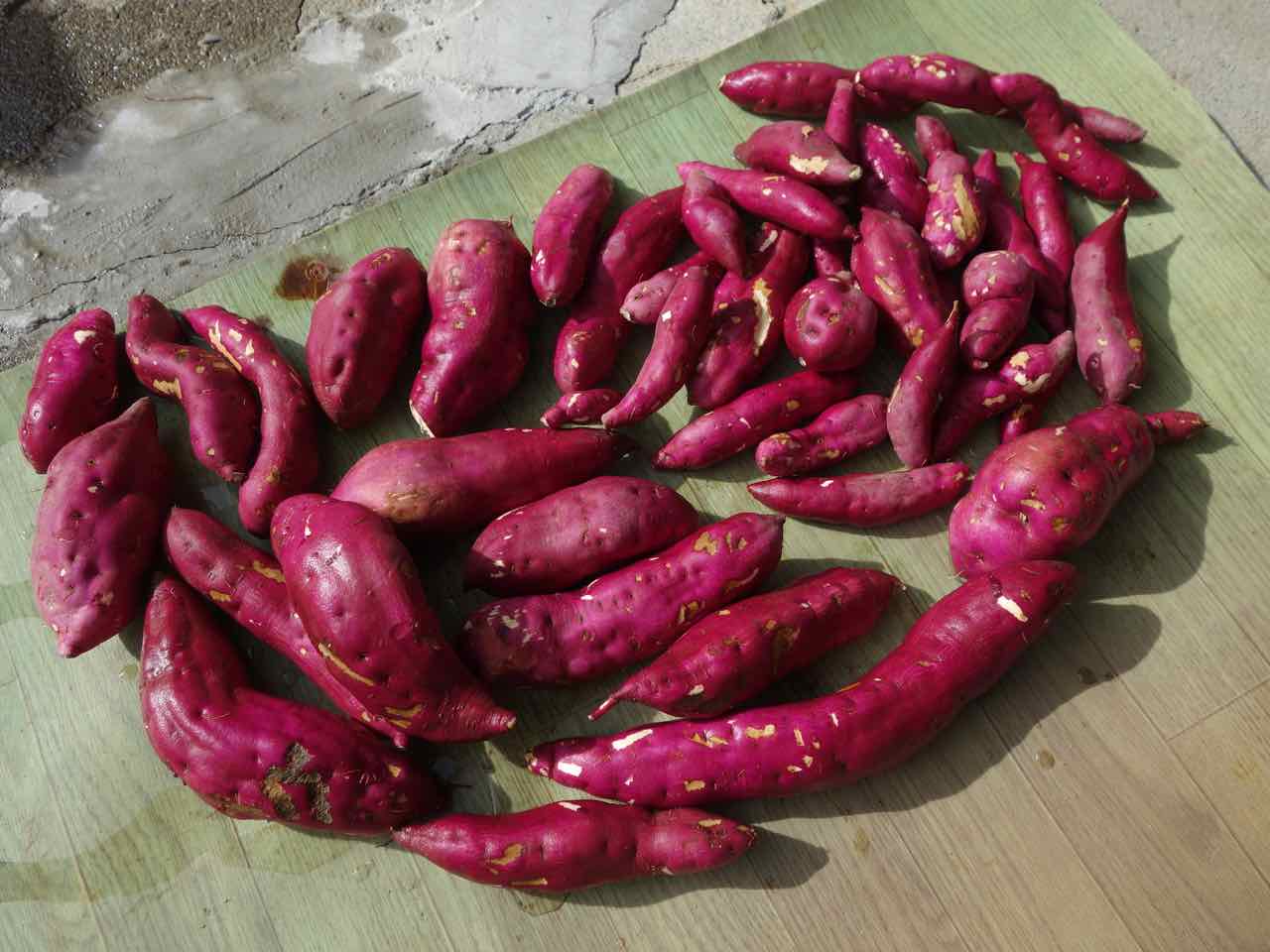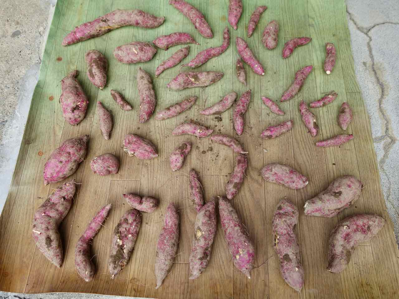 おばちゃんは八頭(やつがしら、里芋の一種)を掘ってるところだったのに、さつま芋畑に行き、掘ってくれた。こ〜んなに!(持って帰って天日干し中) おまけに八頭もあげると、両方持って帰るのが重たいほどいただいた。ありがとうございました!(^^) |
