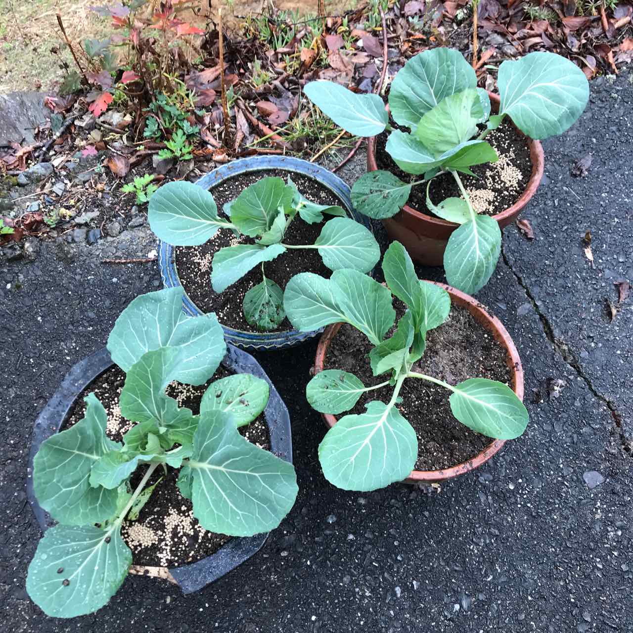 10月にもらったキャベツの苗。畑に植えた苗は、我が家の大杉を切った時に踏み潰されちゃってなくなったけど、鉢に植えたのは大きくなり、これ以上大きくなったらヤバイ〜