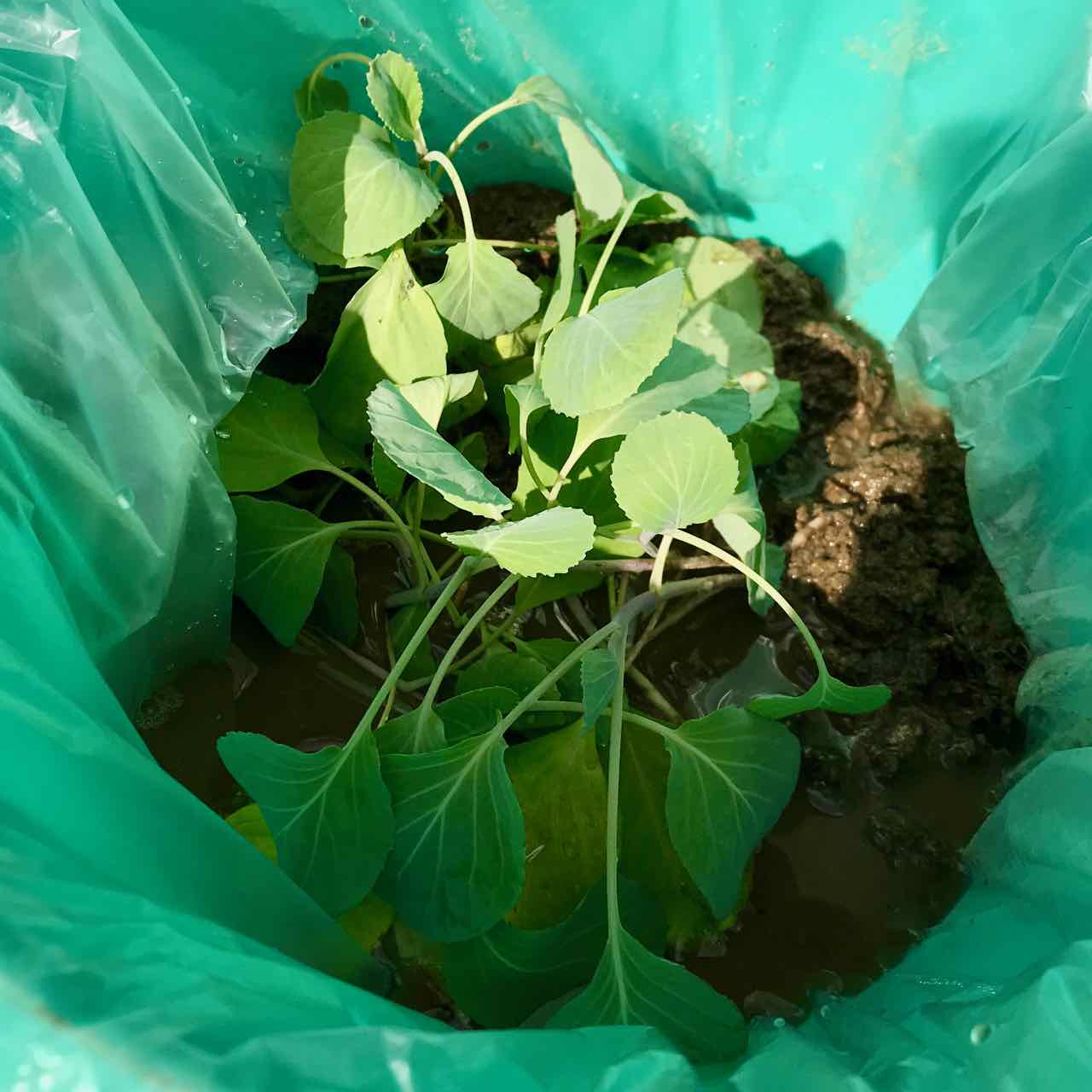 18日に剣山に上がる前日、散歩仲間のおっちゃんちでいただいたキャベツ苗。いただいたのが夕方で、家に帰ったら暗くなっていたから植えられず、ビニール袋のまま水を多めにやっておいていたのを、今日ようやく植えた!