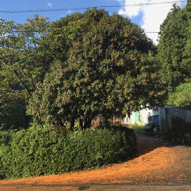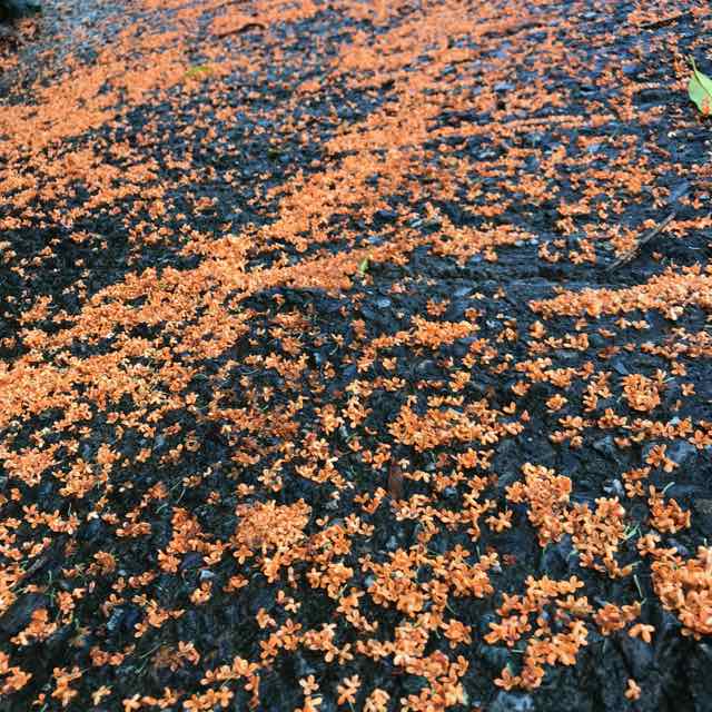 4日に剣山へ行く日の朝、道路がオレンジ色になっていると思ったら、前日の雨であらかた散ってしまった金木犀の花だった! 香港では桂花と言い(銀木犀も桂花)、この花を乾燥させてお茶に入れたりスイーツに入れたりする。よって私も試してみようかと思うのだが、毎年花をもらう前に散ってしまうんだなぁ〜