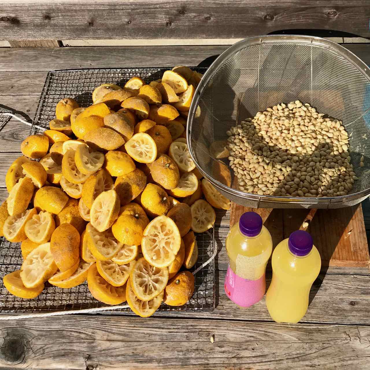 半分ほど搾ってこんなに種が出て、500mlのペットボトル約2本分。つまり今日は約2リットルの酢がとれたのだ。まだ新しい舌は刺激物に弱く、酸っぱいものはちょい苦手だからもう充分なんだけど、まだ柚は沢山あるし、もう少し採ってきて搾ろうかなぁ?