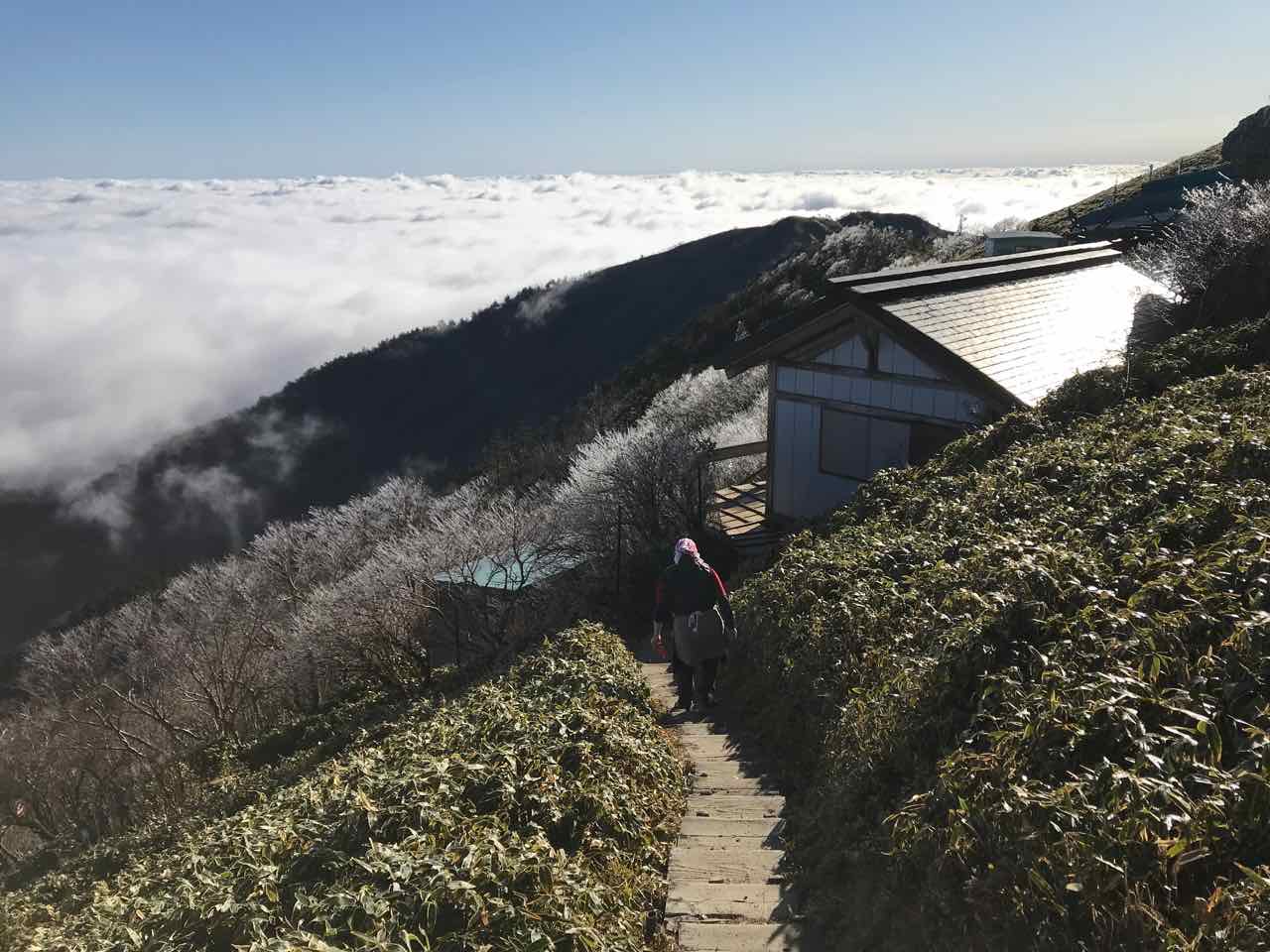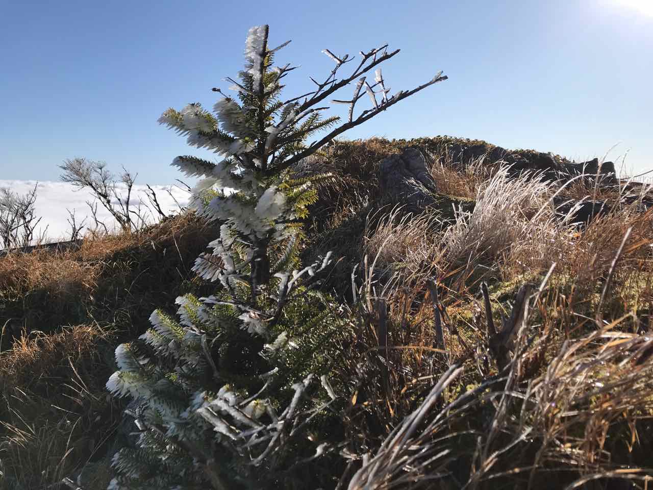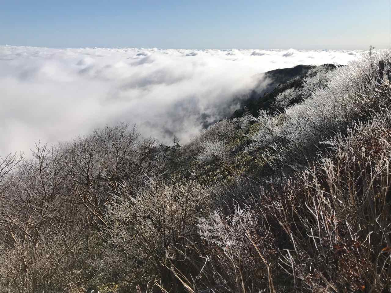 9日の朝焼けは綺麗で大霜が降り、気温は氷点下! 翌10日は氷点下まで下がらなかったものの、8時過ぎから霧が晴れて、なんと、雲海と霧氷が見られた! |