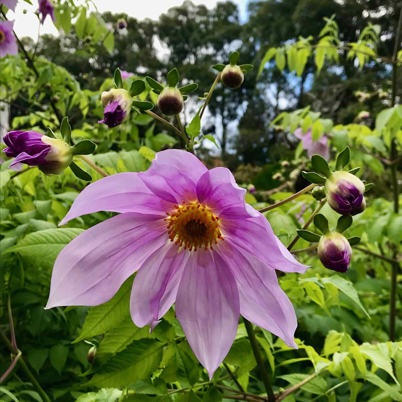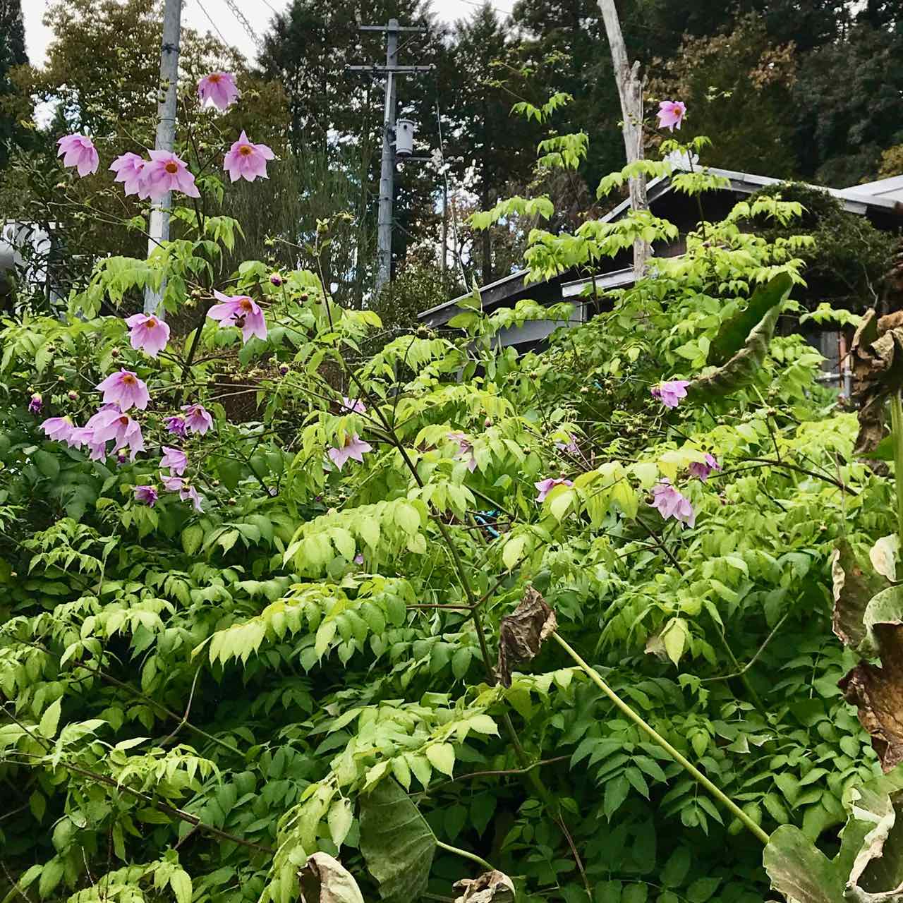 皇帝ダリアは別名、木立(きだち)ダリア、ツリーダリアともいうそうで、これは隣のおっちゃんちの。3メートル近くあって、でかくて驚いていたのに、ネットによると8〜10メートルにもなるそうだ!