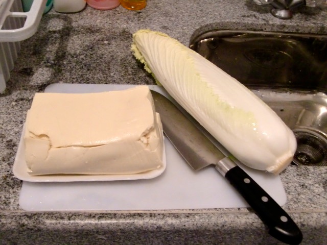 馴染みの街市(青空市場)にも寄り、1丁$3.5の豆腐が閉店間際で 2丁で$6≒80円になってたから購入。長い白菜と、今夜は湯豆腐だ。