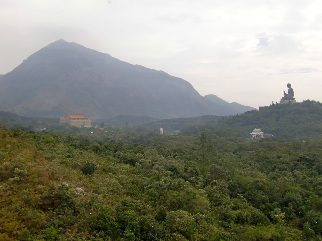 昂坪(ごんぴん)へ下ると、世界最大ブロンズ製の屋外座禅大仏様がおわし、ゴンピン360というケーブルカーで下山。(左が鳳凰山)