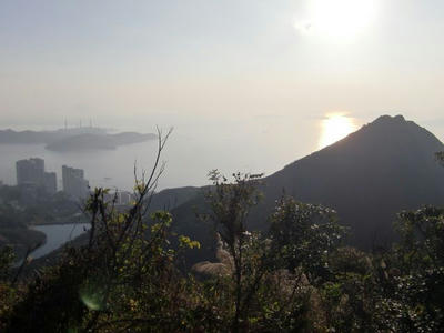 獅子山(Lion Rock)と、なんと馬鞍山が見える! ラマ島と、西高山の向こうに落ちる夕日 17:30、既に正月初二の花火(20:00〜20:23)を待つ人が大勢いる |
