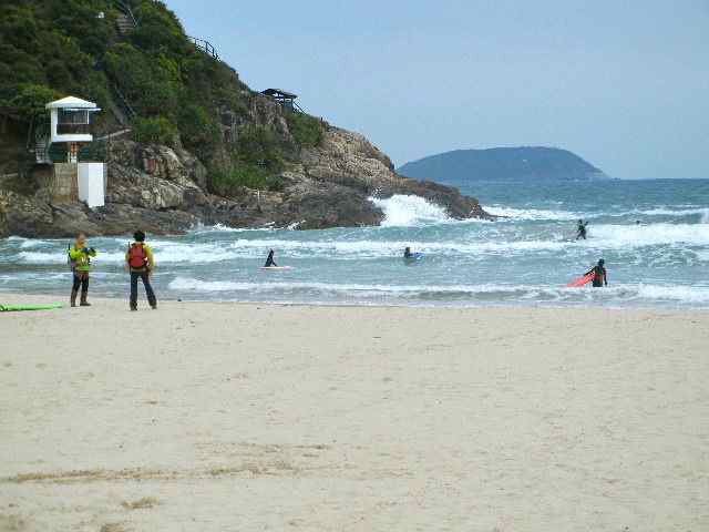 サーファーには大好物の暴風。曇りで肌寒いのに、ゴールの大浪湾では大勢が波に乗っていた。