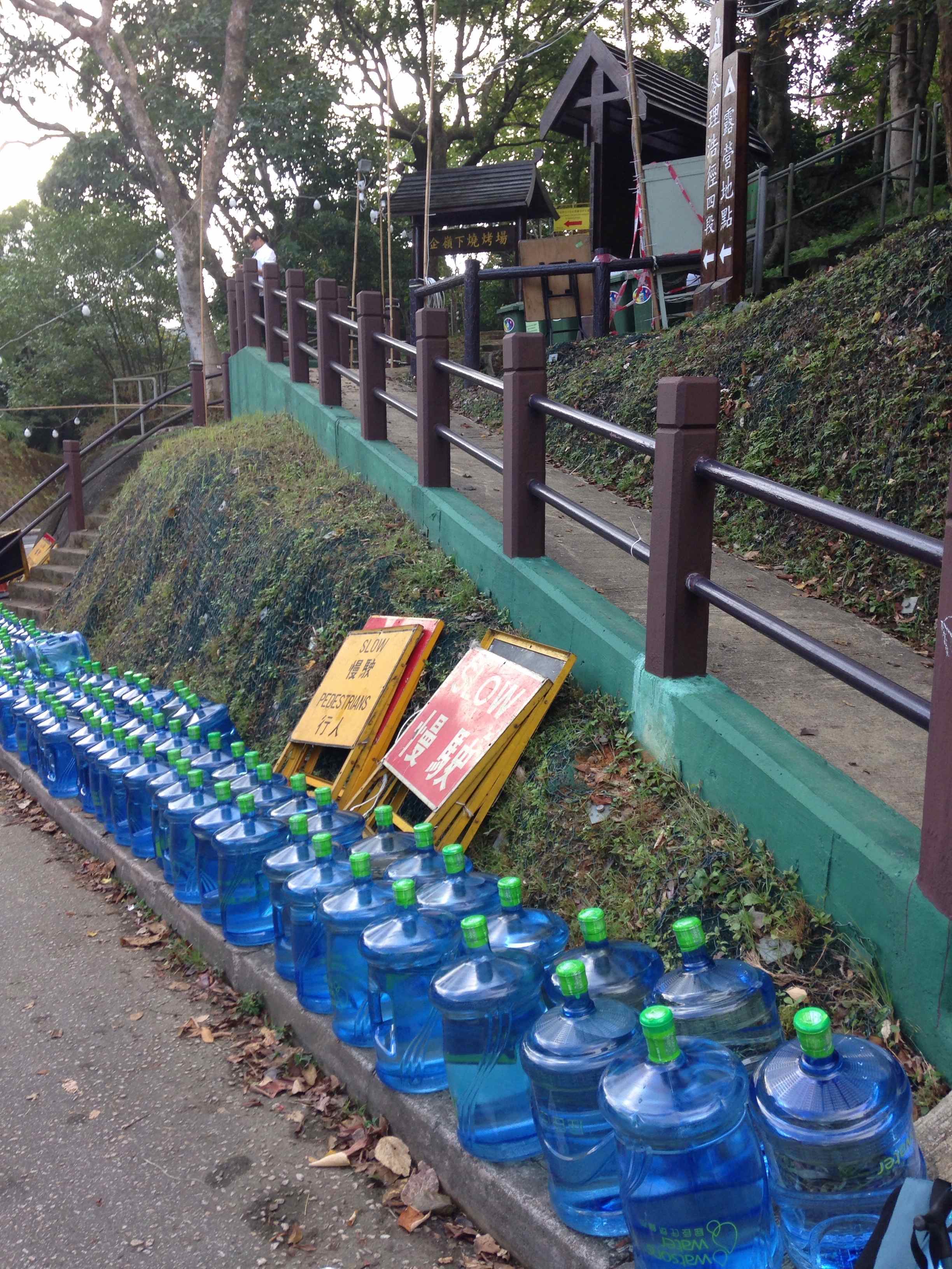 今日は添乗員+お客様10名をご案内して馬鞍山(Ma On Shan, 702m)へ。登山口には金曜日の100km Trailwalkerに備え、5ガロン(18.9リットル)の水のボトルが50個くらい並んでいる。いよいよだ〜 あっアッシは今年サポーターなんだけどね。