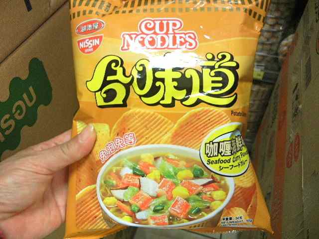 香港でも日清がカップヌードルを作っているが、それをポテトチップスにしたマガイもの? でも左上に「小池屋 NISSIN」と書かれてて、そりゃーやりすぎだろう?と思って調べたら、日本の日清食品と小池屋がユニークな商品の共同開発をしてるそうで、それを香港でもやっているのか。