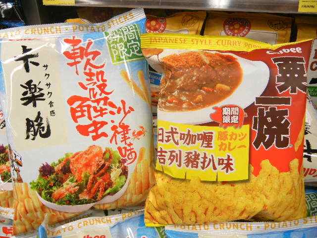 これは両方ともカルビー。右の豚カツカレーって、カレーだけじゃない豚カツの味が加味されているのか? 左は沙律(サラダ)味の軟殻蟹だって。ふ〜ん、買わない。