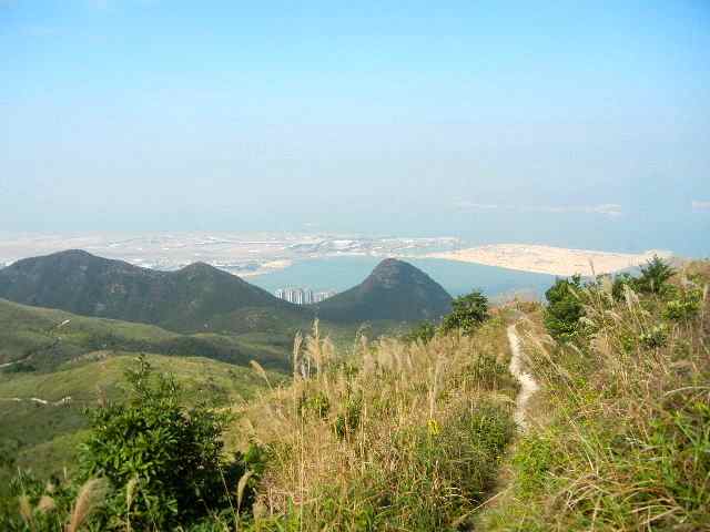 鳳凰徑に出て1キロほど歩いたら、分岐から蓮花山の方へ名前がついてないトレイルに入る。そして写真中央の薄刀屻(左)と婆髻山(右)の鞍部を行く。奥に見える平地は空港。