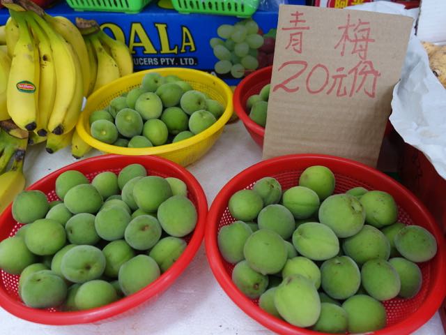 それはさておき、「おうめ」じゃないわよ、「あおうめ」、もう売ってた! 1盛り20ドルだから、約300円。どこ産だろう? 香港人は梅酒とか作らないし、こんな青い梅、どうするんだろう? |