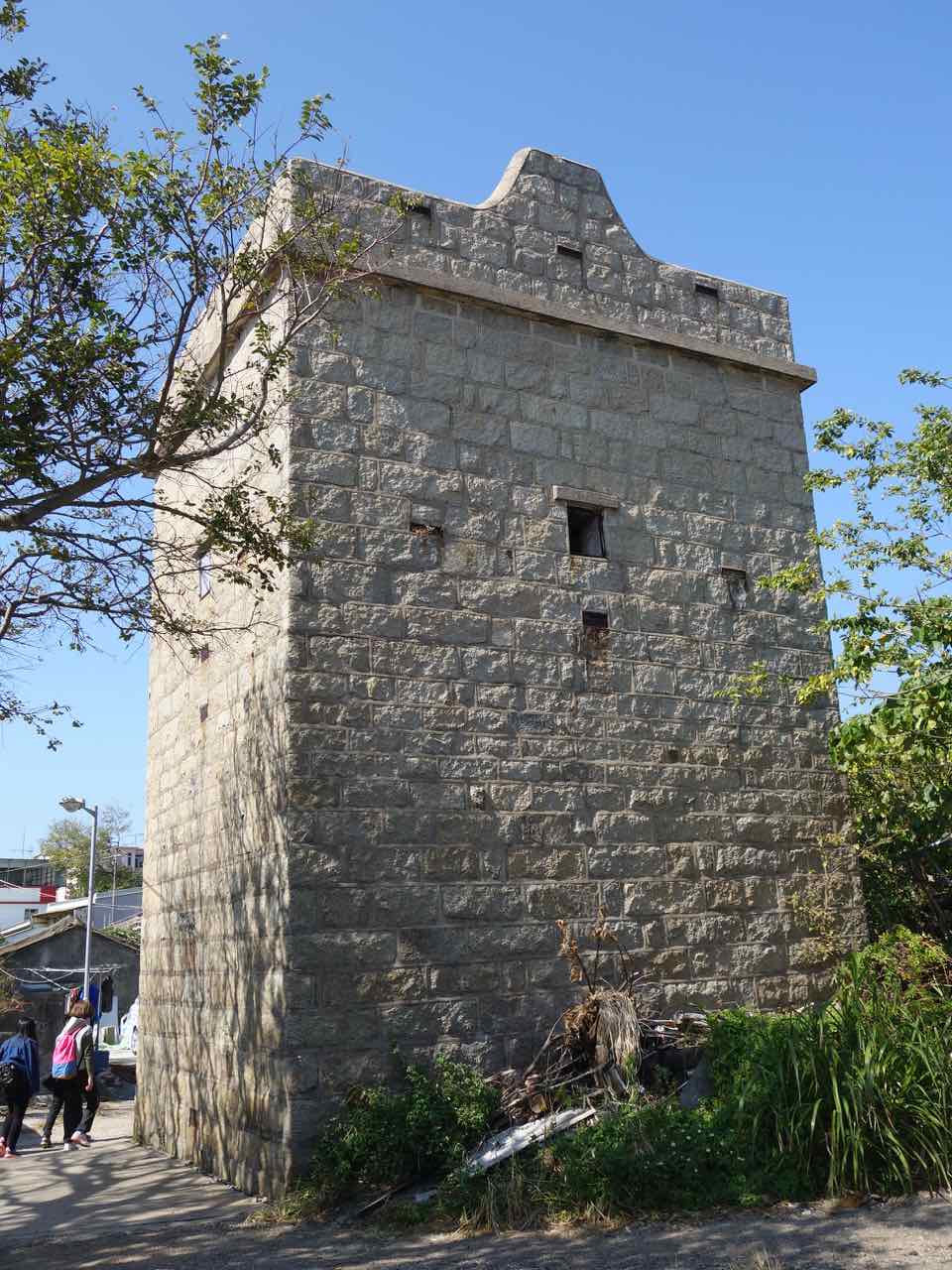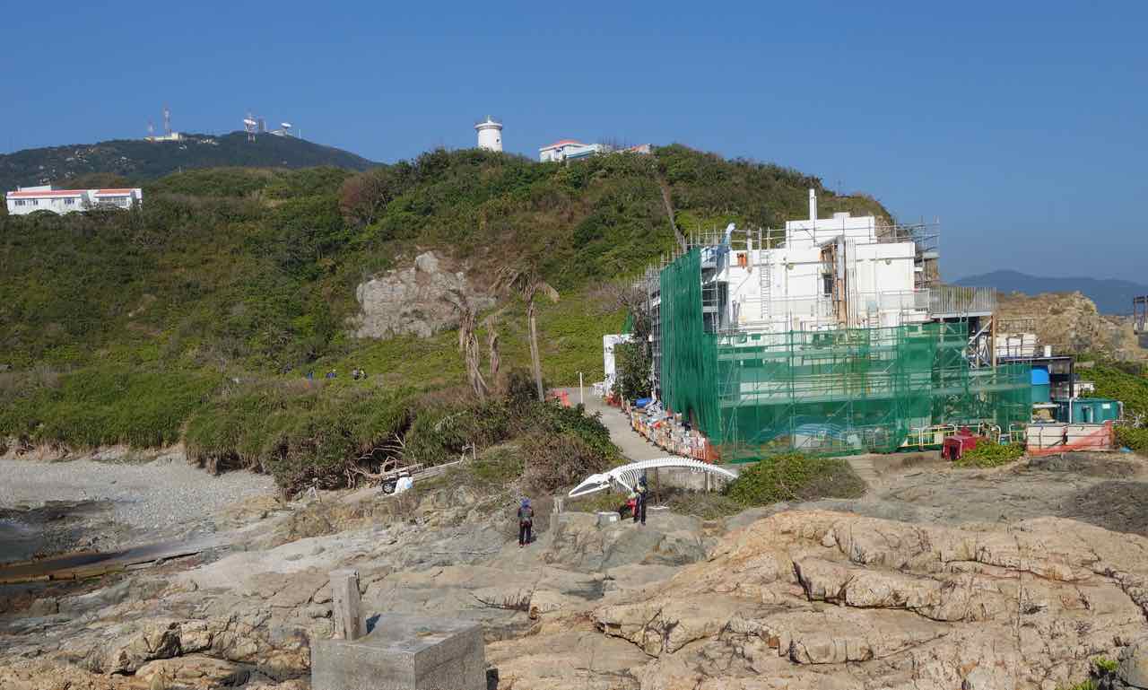 海辺の岸壁から振り返った「太古海洋科学研究所博物館」。後方がサテライトのある鶴咀山(D'aguilar Peak, 325m)。