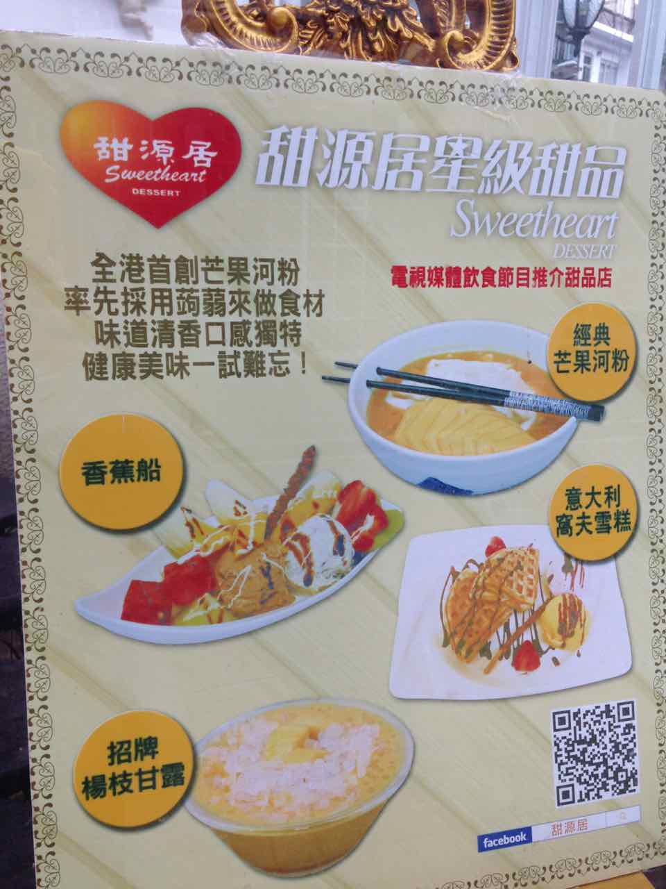 「招牌楊枝甘露」=評判のマンゴー、タピオカ、ポメロ(ザボンみたいなの)が入ったココナッツミルク。「香蕉船」=バナナボート。「經典芒果河粉」=マンゴー入りのきしめんみたいな麺。「意大利窩夫雪糕」=イタリアのワッフルアイスクリーム。